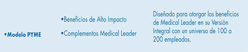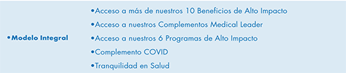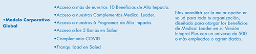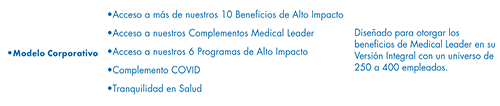 Medical Leader ® Corporativa. Se posiciona como la membresía de servicios médicos integrales de Alto Impacto diseñada especialmente para las empresas que busquen ofrecer a sus empleados, asociados o agremiados una opción en el cuidado y atención de la salud. Resolutiva desde el primer contacto, pagas solo lo que uses con acceso a una asistencia correcta desde el primer momento.